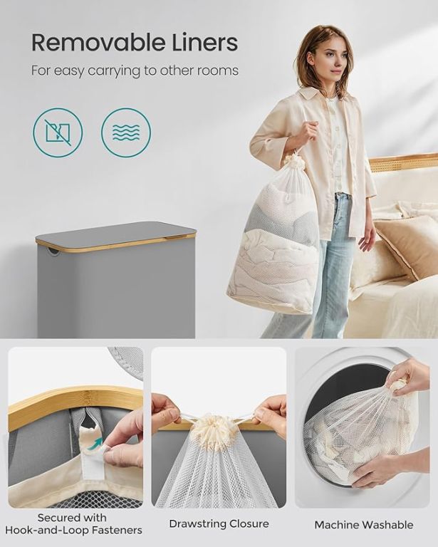 Vychutnajte si poriadok a štýl v každej domácnosti s týmto priestranným 150-litrovým košom na bielizeň. Tri samostatné priehradky vám umožnia ľahko roztriediť bielizeň a ušetriť čas pri praní. Elegantný sivý dizajn s bambusovým rámom sa perfektne hodí do každého interiéru a veko zaisťuje diskrétnosť a ochranu pred prachom.