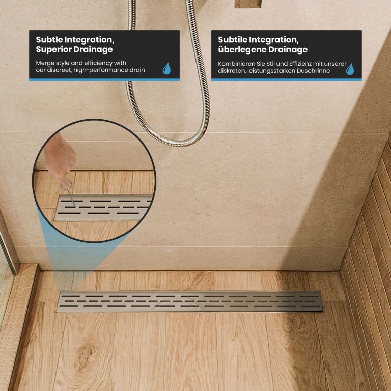 Premeňte svoju kúpeľňu na oázu štýlu a inovácie s našimi vynikajúcimi lineárnymi sprchovými odtokmi. Najvyššia kvalita nehrdzavejúcej ocele, umne leštená, v kombinácii s pieskovaným telom. Váš kúpeľňový dizajn si zaslúži niečo výnimočné, preto sú naše sprchové odtoky navrhnuté nielen tak, aby zaujali, ale aj inšpirovali svojou odolnosťou. Vďaka zapustenému povrchovému materiálu garantujeme produkt, ktorý vydrží skúšku času. Inštalácia je rýchla, nekomplikovaná a nevyžaduje batérie. Mysleli sme na všetko, aby ste sa mohli bez obáv sústrediť na to, čo je dôležité. Vylepšite formu a funkciu svojho sprchového kúta s našim elegantným a odolným lineárnym sprchovým odtokom, ktorý dodá vašej každodennej rutine sofistikovanosť.