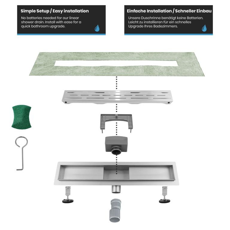 Premeňte svoju kúpeľňu na oázu štýlu a inovácií vďaka našim vynikajúcim lineárnym sprchovacím odtokom. Nerezová oceľ najvyššej kvality, umne kartáčovaná, v kombinácii s pieskovaným hlavným telom. Dizajn vašej kúpeľne si zaslúži niečo výnimočné, preto sú naše sprchové odtoky navrhnuté tak, aby nielen zaujali, ale aj inšpirovali svojou odolnosťou. Vďaka zapustenému povrchovému materiálu vám zaručujeme výrobok, ktorý obstojí v skúške času. Inštalácia je rýchla, nekomplikovaná a bez nutnosti použitia batérií. Mysleli sme na všetko, aby ste sa mohli bez obáv sústrediť na to podstatné. Vylepšite tvar a funkciu svojho sprchového kúta pomocou nášho elegantného a odolného lineárneho sprchového odtoku, ktorý dodá vašej každodennej rutine sofistikovanosť.