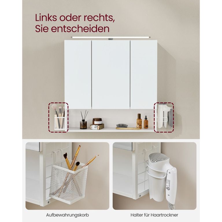Vysoko kvalitné materiály, ako sú drevotrieskové dosky, oceľ a sklo, zaručujú pevnosť a odolnosť. Jednoduchá montáž a praktické príslušenstvo, ako je držiak na fén a úložný kontajner, potešia každého, kto má rád poriadok. Údržba je jednoduchá a skrinka vydrží každodenné používanie.