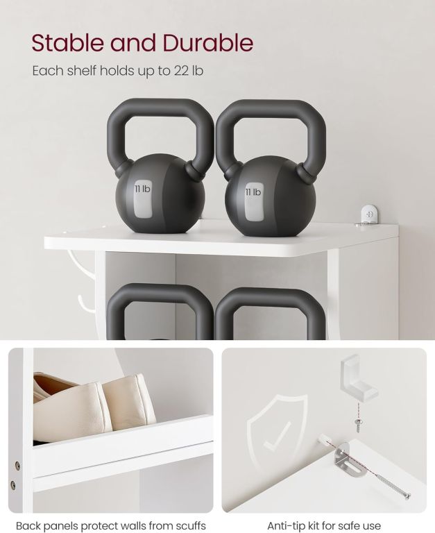 Odolné drevotrieskové dosky a oceľové háčiky zaručujú dlhú životnosť a stabilitu. Nosnosť 10 kg na policu umožňuje odkladať aj ťažšie topánky, zatiaľ čo protisklzové prvky a možnosť montáže na stenu zvyšujú bezpečnosť. Montáž trvá len chvíľu.