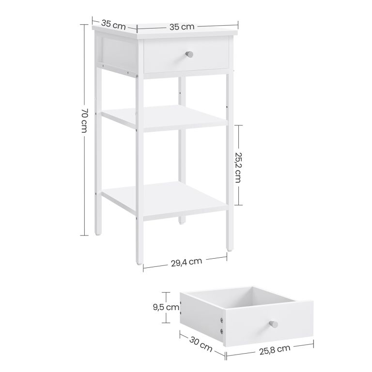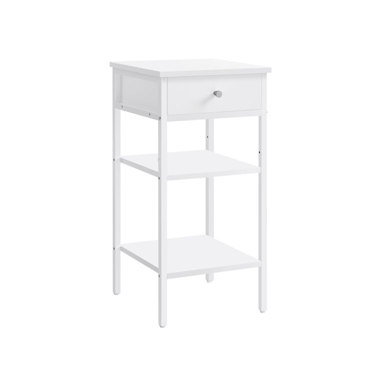 Biely nočný stolík s policami a zásuvkou, 35x35x70 cm