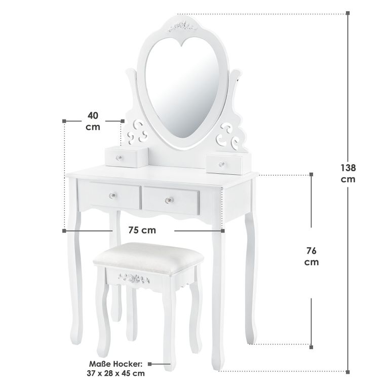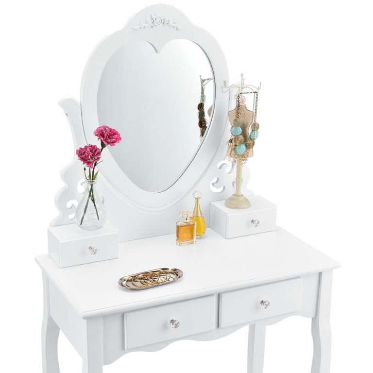 Elegantný kozmetický stolík Julia srdce, štyri zásuvky a pohodlný taburet. Na štýlové líčenie aj úpravu vlasov.