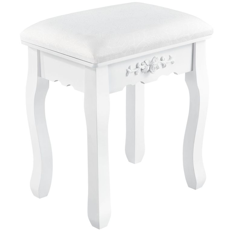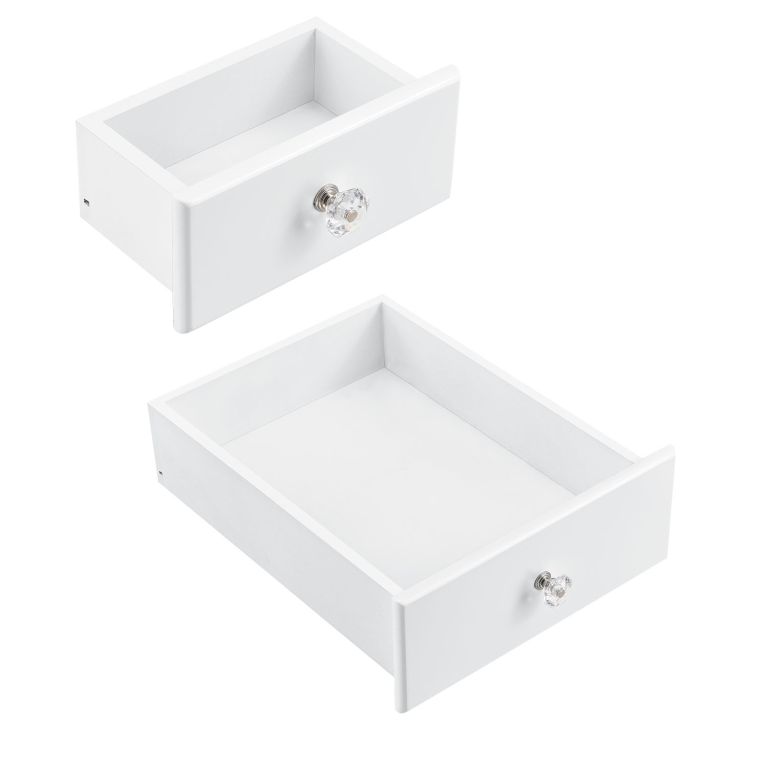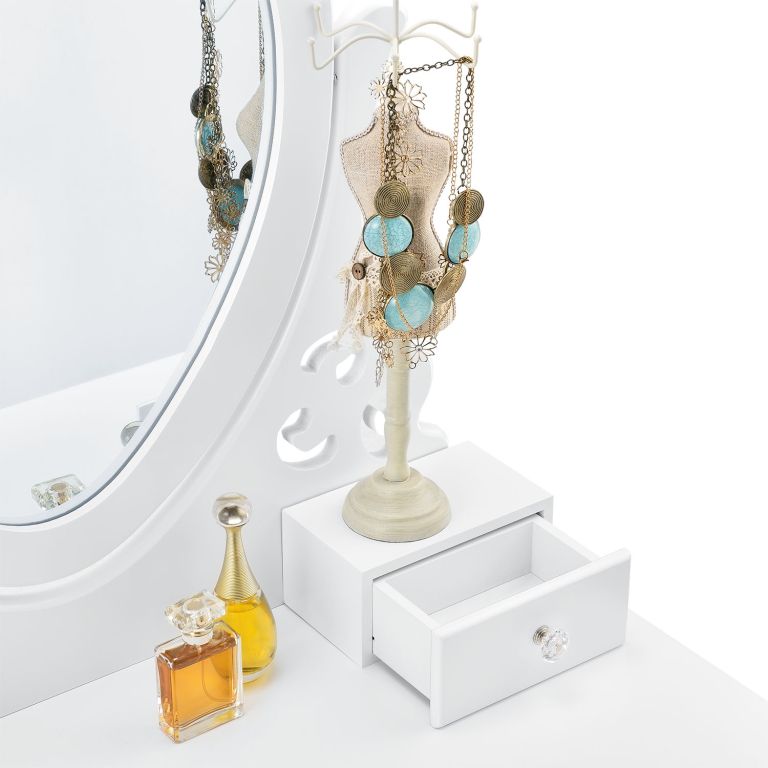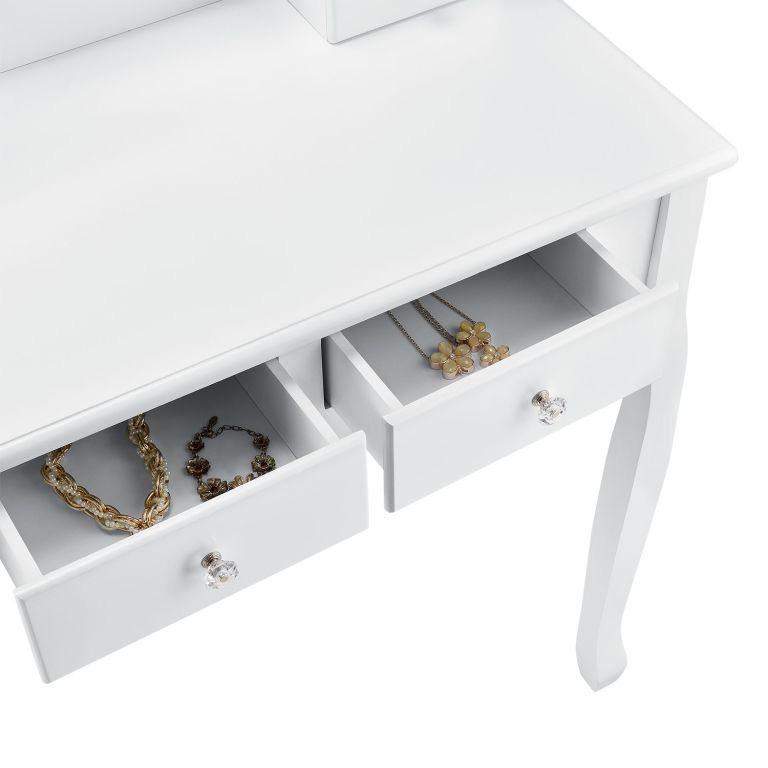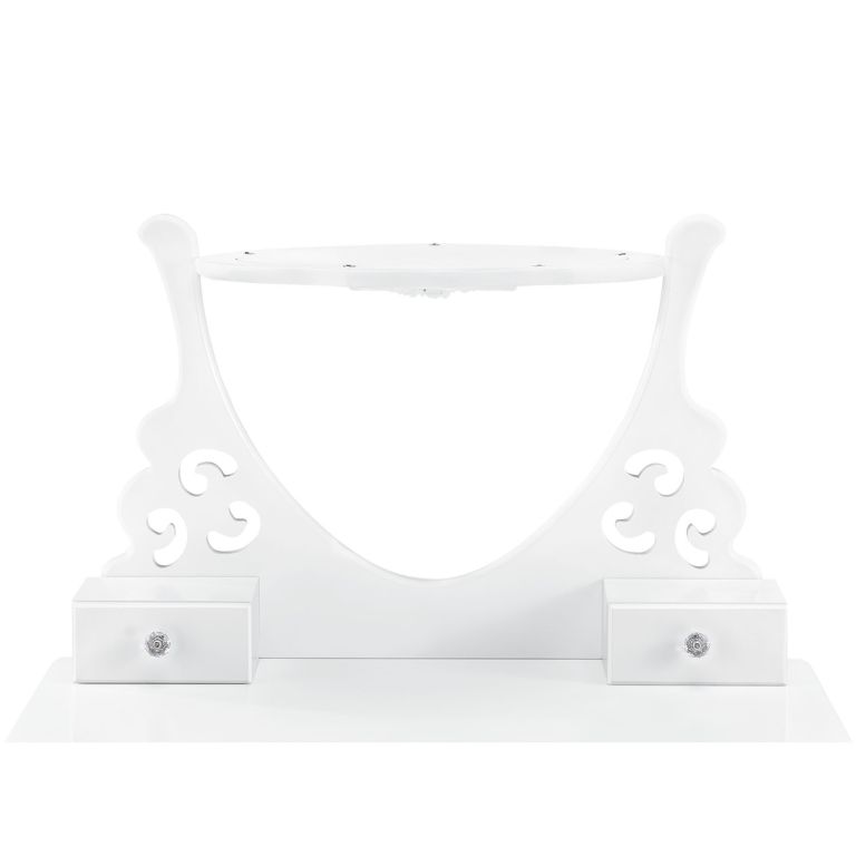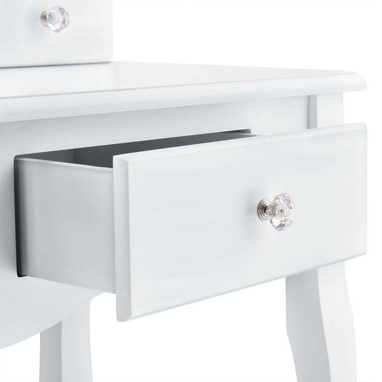 Stolík je vyrobený z pevného MDF materiálu s bielym lakom, ktorý chráni povrch pred poškriabaním. Štyri zásuvky umožnia prehľadné uloženie všetkých kozmetických potrieb. Montáž je jednoduchá a rýchla, údržba nenáročná.