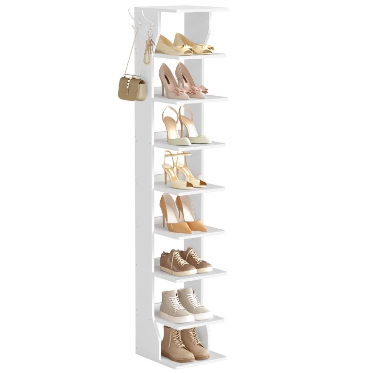 Úzky biely botník s háčikmi, 9 políc, ideálny do malých bytov a úzkych chodieb.