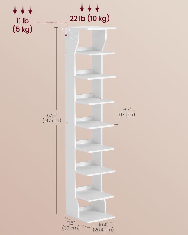 Premeňte chaos v predsieni na dokonalý poriadok vďaka úzkemu botníku s deviatimi policami. Elegantný biely dizajn skvele zapadne do každého interiéru a praktické háčiky vám umožnia mať kľúče či kabelku vždy po ruke.