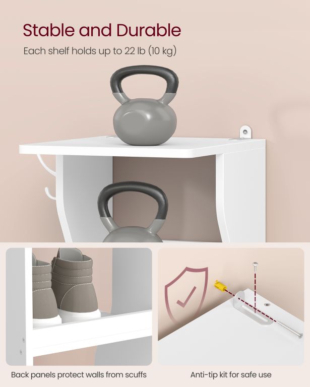 Odolná drevotrieska a oceľ zaisťujú dlhú životnosť a stabilitu. Každá polica unesie až 10 kg, háčiky až 5 kg. Montáž je jednoduchá a vďaka priloženej sade proti prevráteniu je botník bezpečný aj v domácnostiach s deťmi.