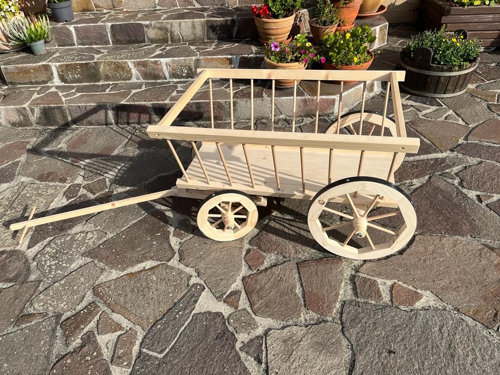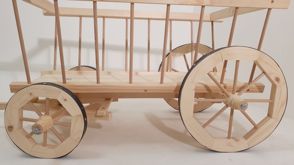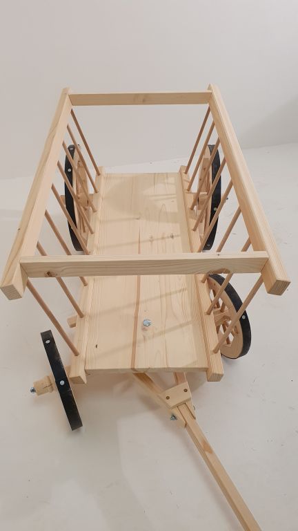 Žebriňák je vyrobený z masívneho smrekového alebo borovicového dreva a má kovové okovanie kolies pre dokonalý vzhľad. Dodáva sa bez povrchovej úpravy, takže si môžete zvoliť vlastný spôsob ochrany dreva. Montáž je jednoduchá – stačí pripevniť oj.