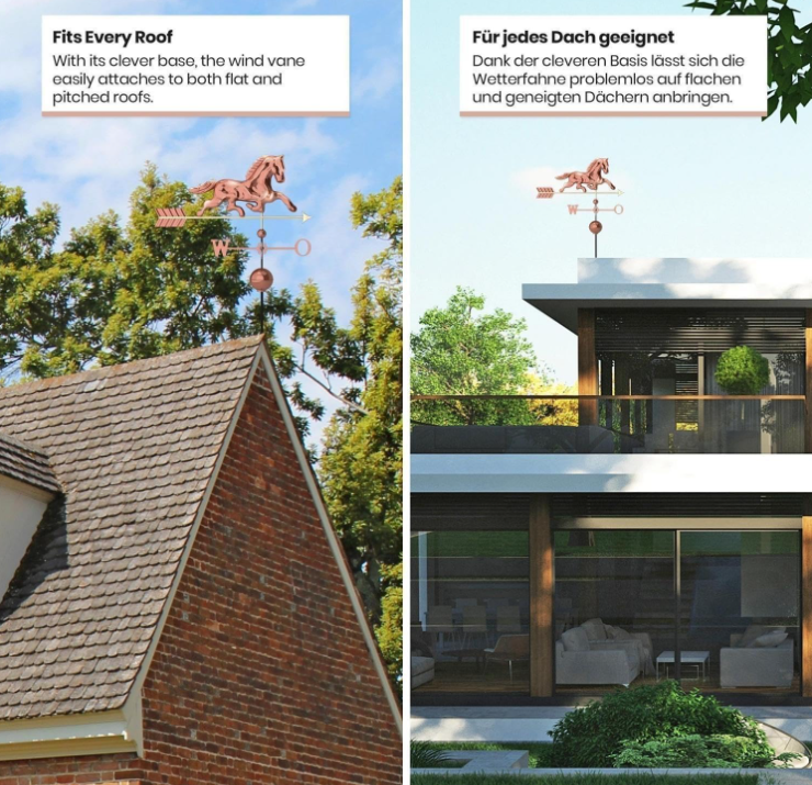 Montáž je jednoduchá vďaka univerzálnemu podstavcu, ktorý umožňuje upevnenie na plochú aj špicatú strechu. Kvalitné materiály – meď, mosadz a oceľ – zaisťujú dlhú životnosť a minimálnu údržbu. Rozmery 97 x 46 x 116 cm zaručujú, že bude dobre viditeľná a funkčná.
