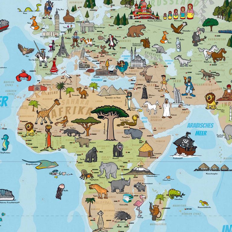 Krásne navrhnutá a detailná detská náučná mapa. Všetok obsah detskej mapy je ručne nakreslený. Didakticky veľmi hodnotný obsah je daný tým, že všetky zvieratá, rastliny a budovy boli správne priradené a popísané geograficky. Na mape je neuveriteľne mnoho informácií, ktoré môžete objaviť a naučiť sa. Mená krajín, zvieratá, rastliny a zvláštnosti vo všetkých smeroch ilustrované vás inšpirujú k snívaniu. Tento skvelý plagát pre deti je doplnený o fakty o jednotlivých krajinách, ako sú hlavné mestá, veľkosti krajín a populácie, ako aj súvisiace vlajky alebo zástavy.