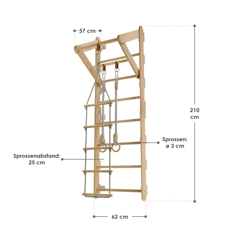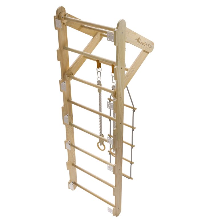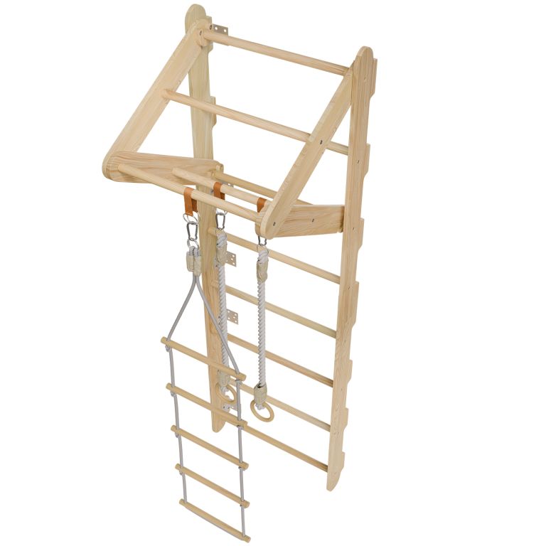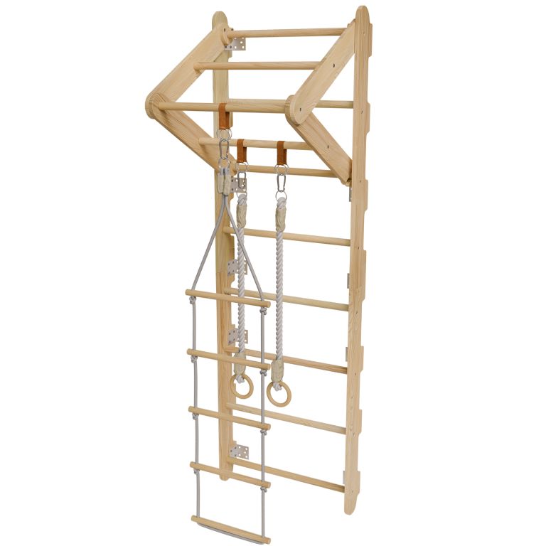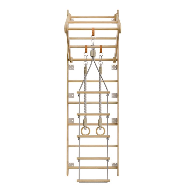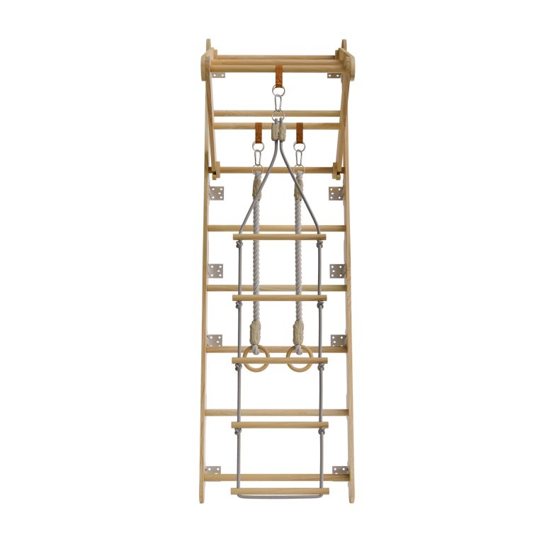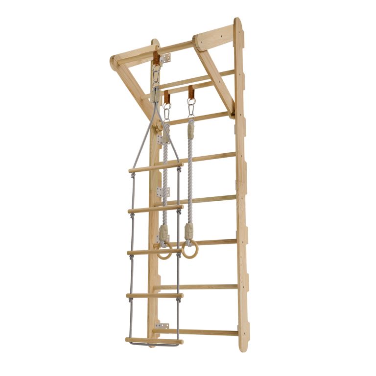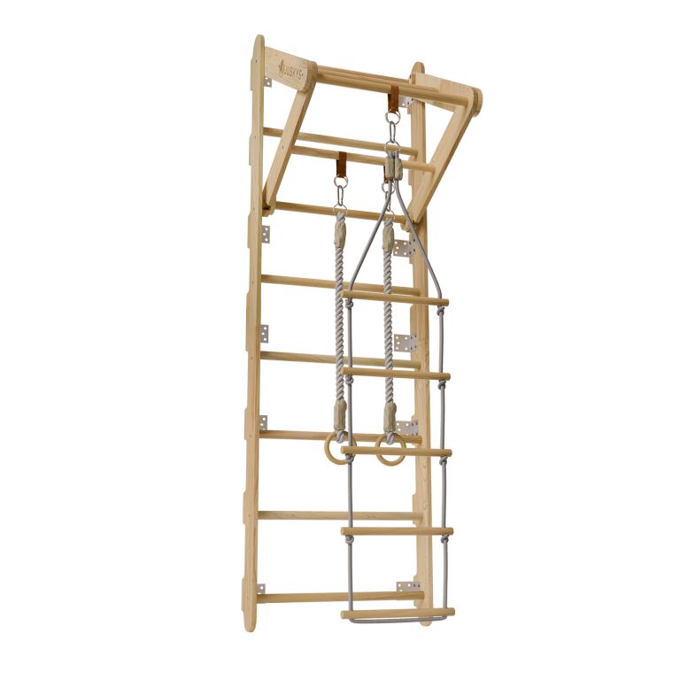 Rebriny sú vyrobené z kvalitného prírodného dreva a pevne ukotvené k stene, takže vydržia aj intenzívnejšie detské výkony. Vďaka kompaktným rozmerom sa hodí aj do menších priestorov. Zavesené prvky je možné jednoducho meniť podľa nálady alebo veku dieťaťa. Výborne sa hodí pre deti od 3 do 12 rokov a pomáhajú budovať nielen silu, ale aj sebadôveru.