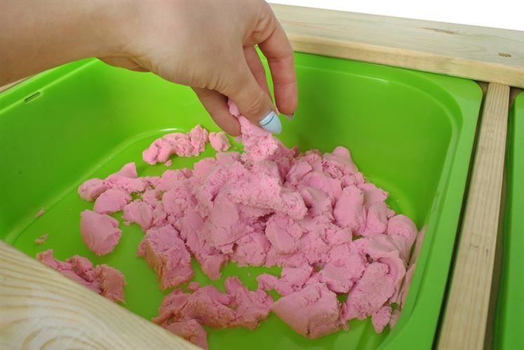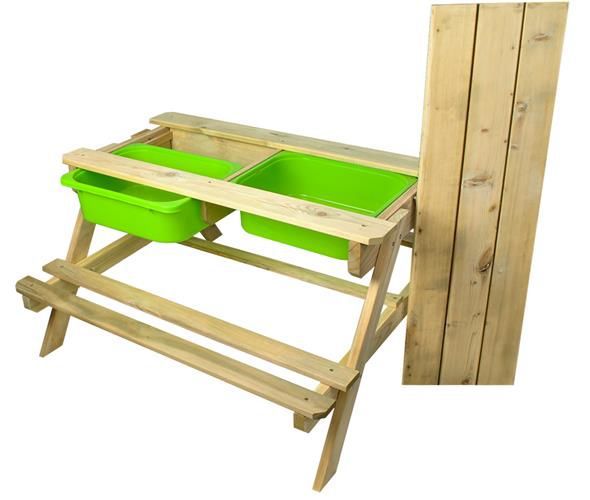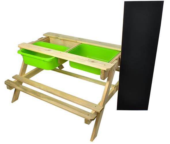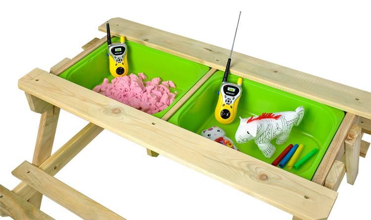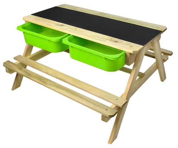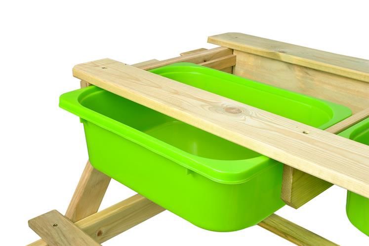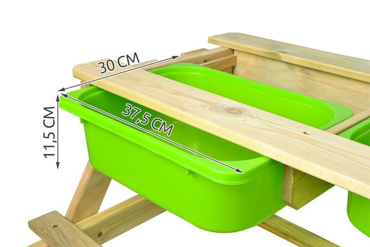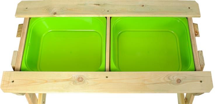 Uprostred dosky je odnímateľný kryt, pod ktorým môžete do zostavy vložiť dva veľké kontajnery, ktoré Vám umožnia uložiť všetky veci, ktoré potrebujete pre deti, aby sa bavili. Ľahko uskladníte potreby na písanie, kreslenie a maľovaie, plastelíny, stavebnice alebo poklady nájdené v záhrade - gaštany, kamene alebo žalude. Plastové kontajnery môžu byť tiež použité aj na hranie s vodou a pieskom.