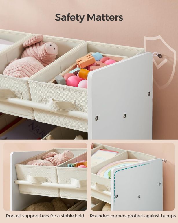 Stabilná konštrukcia z kvalitného MDF zaisťuje dlhú životnosť a bezpečnosť. Povrch je hladký a bez ostrých hrán, čo minimalizuje riziko úrazu. Montáž zvládnete behom chvíľky a vďaka priloženej sade proti prevráteniu bude organizér bezpečný aj v detskej izbe.