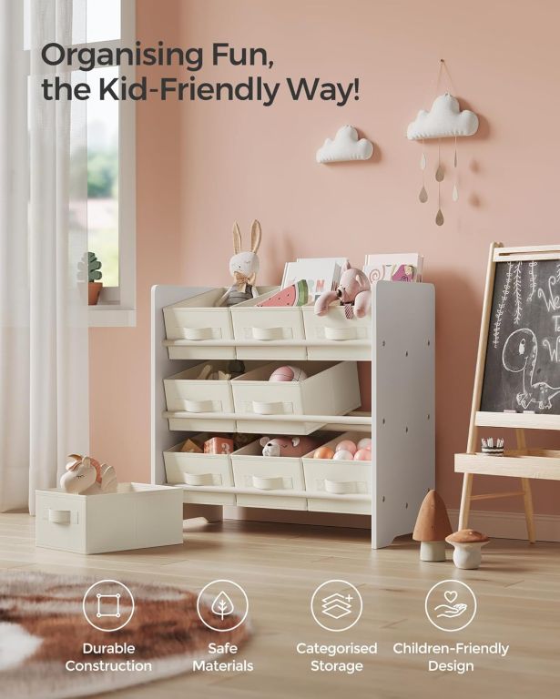 Vytvorte deťom útulný a prehľadný priestor na hranie i učenie. Tento elegantný organizér v oblaku bielej farbe pomôže udržať izbu vždy upratanú a deti si ľahko nájdu všetko, čo potrebujú. Deväť priestranných boxov pojme hračky, knihy aj ďalšie poklady a vďaka praktickým úchytom je manipulácia jednoduchá aj pre malé ruky.