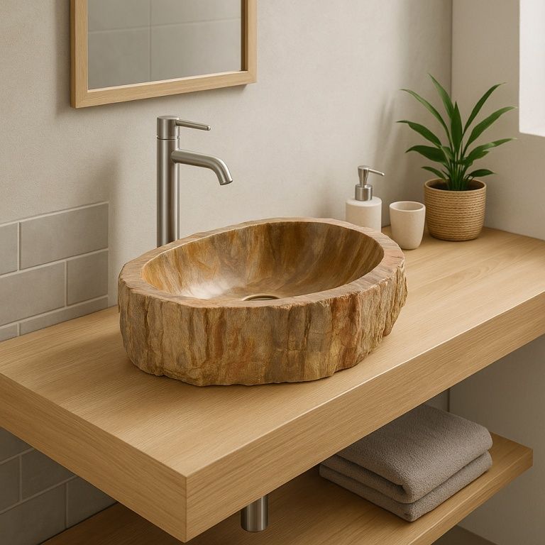 Masívne, exkluzívne kamenné umývadlo vyrobené zo skameneného kmeňa stromu. Najmä vďaka svojmu drevenému designu okamžite upúta a Vaša kúpeľňa bude mať veľmi príjemnú atmosféru. Unikátny vzhľad tohto fosílneho umývadla spája vrelosť dreva s chladnou aurou ušľachtilého kameňa. Malé praskliny a priehlbiny, ktoré vznikli pred miliónmi rokov boli plné prírodnej živice.