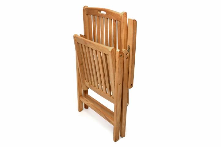 Pohodlné skládací židle i stůl jsou vyrobeny z kvalitního týku a vynikají velmi pečlivým zpracováním. Ergonomicky tvarované židle mají mosazné kování a zádová opěrka je nastavitelná do pěti poloh. Nábytek je velmi stabilní, ručně zpracovaný a odolný vůči nepříznivým vlivům počasí. Tato sedací souprava se hodí především na terasy, kde si s rodinou a přáteli můžete užívat příjemného posezení.
