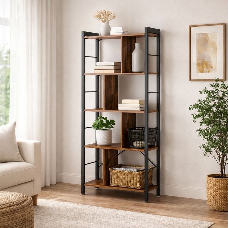Vďaka pevnej oceľovej konštrukcii a výstuhám unesie každá polica až 20 kg, takže zvládne aj objemné zväzky či dekorácie. Montáž je jednoduchá vďaka číslovaným dielom a prehľadnému návodu. Praktické postranné lišty zabránia pádu kníh a doplnkov, zatiaľ čo otvorený dizajn dodá priestoru vzdušnosť.