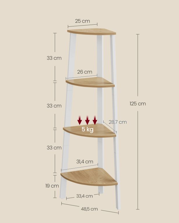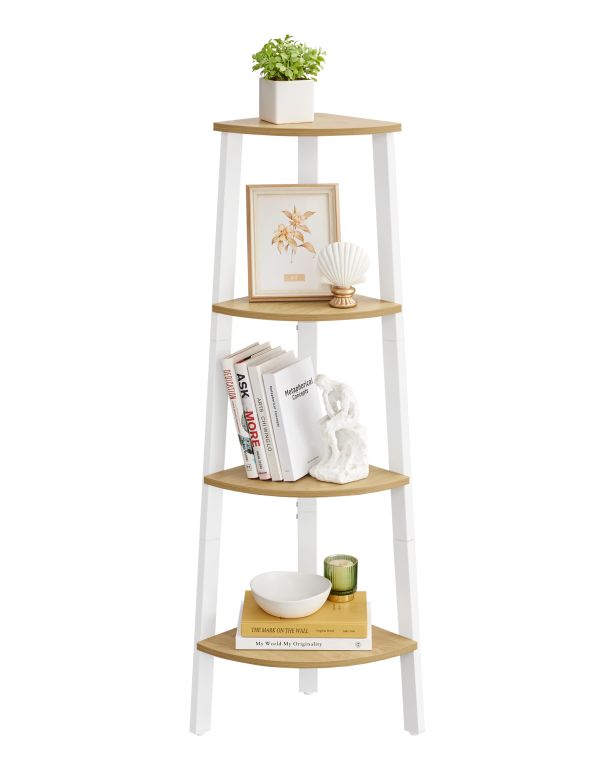 Táto moderná rohová polica kombinuje prírodný dub a matnú bielu oceľ a ponúka elegantné riešenie pre každý interiér. Štyri odkladacie police vytvárajú krásny priestor pre vaše knihy, kvety, dekorácie alebo praktické drobnosti v akejkoľvek miestnosti. Vďaka trojnožkovému dizajnu a nastaviteľnej zadnej nohe stojí stabilne aj na mierne nerovných podlahách, zatiaľ čo bezpečnostná súprava proti prevráteniu zabraňuje náhodnému prevráteniu.