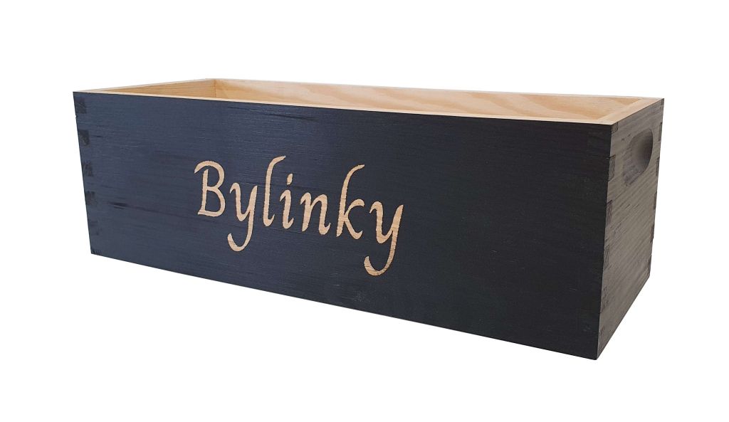 Box je vyrobený z masívnej borovice, má vyfrézované úchyty po stranách a vďaka nim sa pohodlne prenáša. Čierne prevedenie pôsobí elegantne a nápis jasne napovie, čo v ňom má svoje miesto. Dodáva sa zložený, takže ho môžete hneď používať – doma aj vonku pod strechou.
