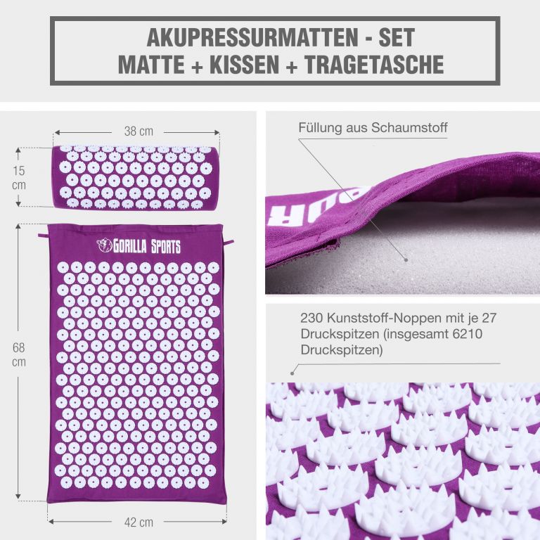 Akupresúrna podložka je masážna podložka, ktorá vychádza zo starej čínskej tradície a môže pomôcť uvoľniť blokády a znížiť bolesť. Špičky, ktoré majú rovnaký účinok ako fakírska doska, podporujú prekrvenie prostredníctvom cielenej masáže. Akupresúrna podložka v rôznych farbách je ideálna pre každého, kto si chce len oddýchnuť. Po náročnom dni v práci alebo náročnom tréningu zaistia tvrdé plastové nopky silné prekrvenie a s tým spojené uvoľnenie najmä chrbtových a šijových svalov.