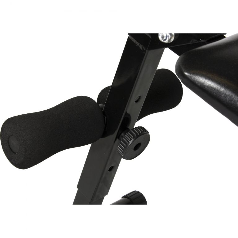 Sklon tejto lavičky umožňuje výrazne zintenzívniť tréning každého brušného svalu v porovnaní s prevedením na vodorovnej úrovni ako veľmi, je možné individuálne nastaviť v troch krokoch podľa osobných potrieb. Aby sa tréning na naklonenej rovine nestal balansovaním, má táto lavička praktické podpery nôh, ktoré zaisťujú a fixujú telo bez toho, aby ho nútili do nepohodlnej polohy. Vďaka 10 rôznym variantom úchopu ponúka táto multifunkčná tyč na montáž do rámu dverí viac ako dostatočný potenciál pre tréning všetkých "svalov"