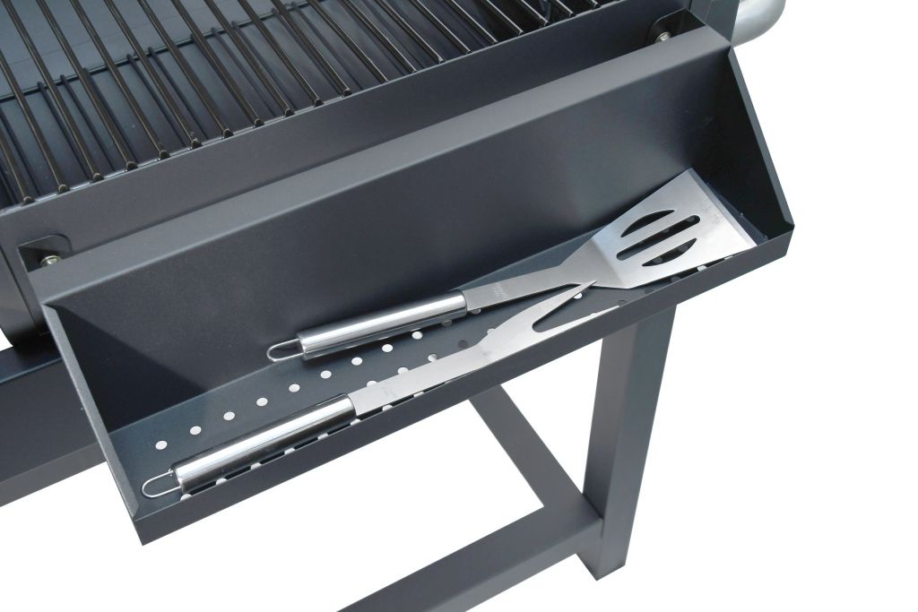 Konštrukcia je vyrobená z kvalitného oceľového plechu s odolným čiernym povrchom. Madla z nerezu majú dostatočný priestor pre úchop a zvyšujú eleganciu grilu. Stabilitu zaisťujú kovové nohy, doplnené o spevňujúci rám v spodnej časti. Navše je gril vybavený kolieskami z plastu, ktoré zaručujú dostatočnú pohyblivosť. Gril je vybavený regulovateľnou ventiláciou, niekoľkými odkladacími priestormi a bočnou poličkou s rozmermi 20 x 43 cm. Obe veka grilu sú vybavené teplomerom a komínkami pre odvod horúceho vzduchu. Plynový gril má impulzné zapaľovanie s pohonom na batériu. Každý z troch horákov je plynule regulovateľný otočným voličom na čelnom ovládacom paneli.
