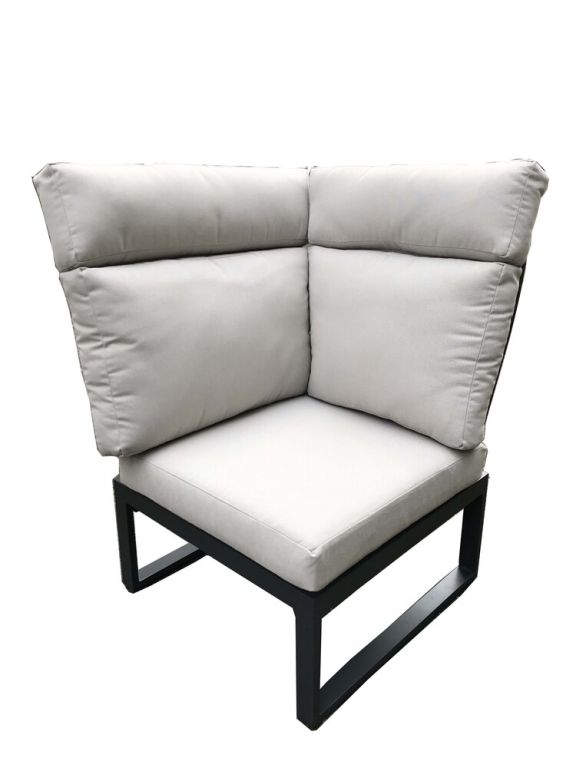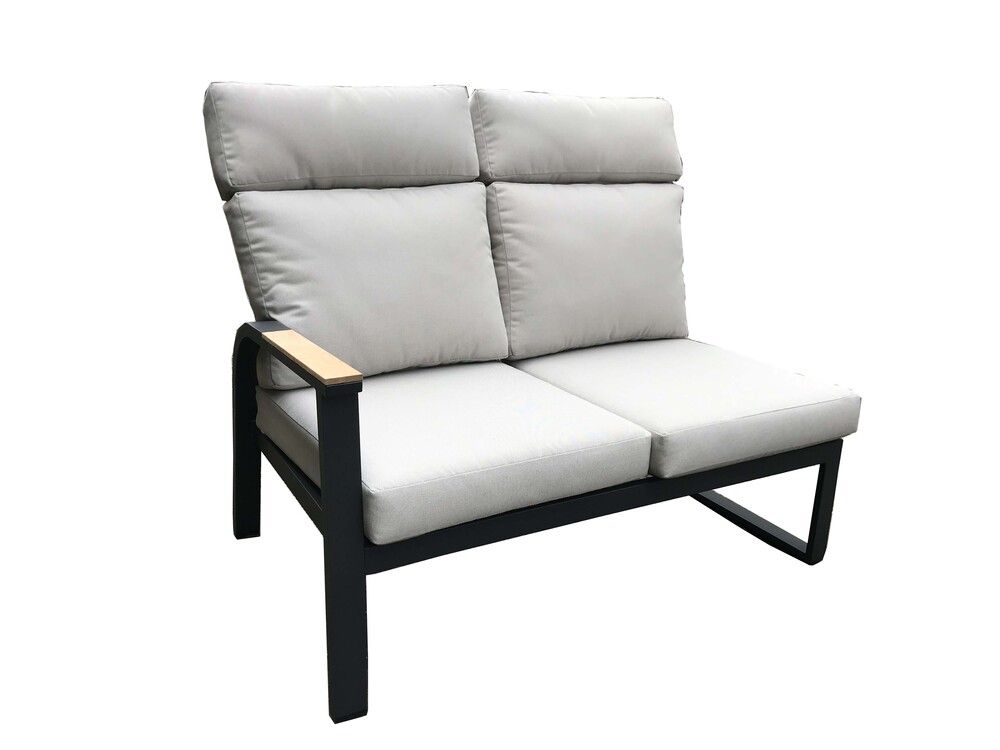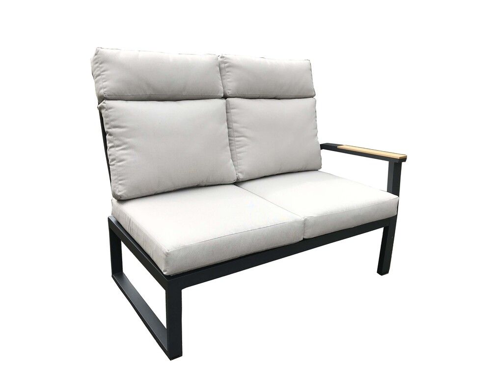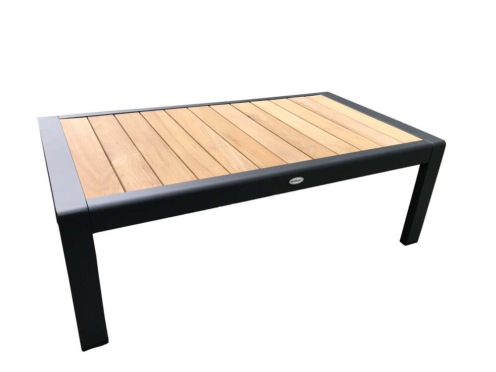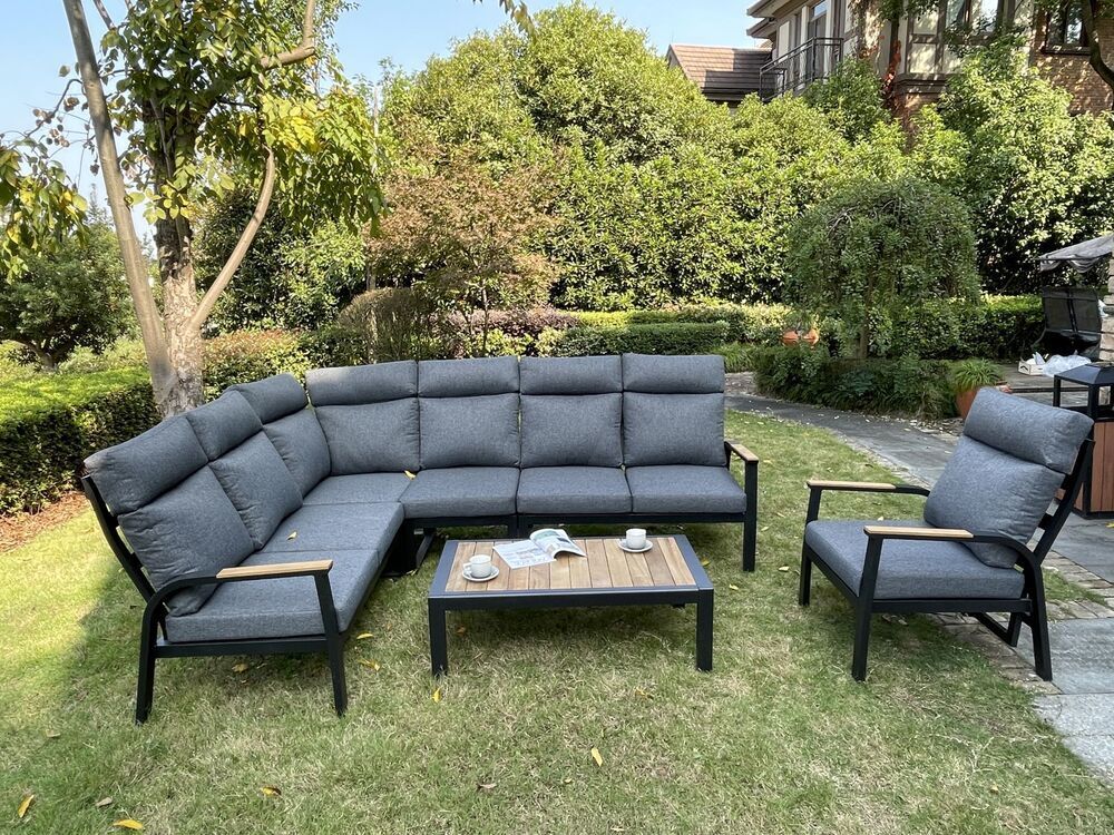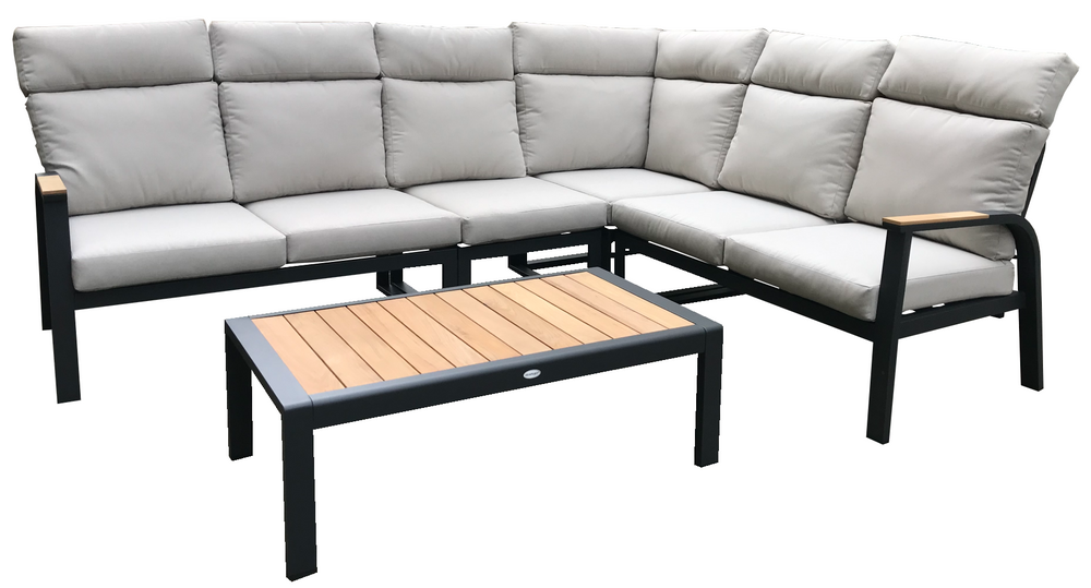 Luxusná hliníková súprava v grafitovom vyhotovení, doplnená teakovými podrúčkami a stolovou doskou. Moderná súprava, ktorá sa perfektne hodí do každého exteriéru alebo interiéru.