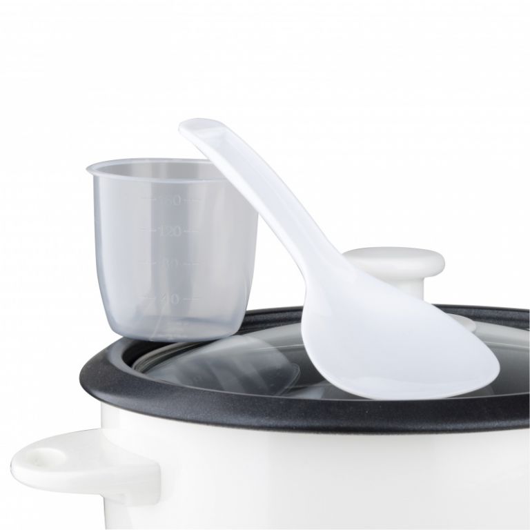 Praktický hrniec na ryžu s kapacitou max. 700 g suchej ryže, automatická funkcia uchovania teploty ryže po dovarení, sklenená pokrievka, praktické madlá na prenášanie, vyberateľná vnútorná nádoba s nepriľnavým povrchom a stupnicou pre ľahké dávkovanie ryže a vody, svetelná signalizácia prevádzky a udržovania teploty, ochrana proti prehriatiu. Lyžica a odmerka na ryžu a vodu súčasťou balenia.
