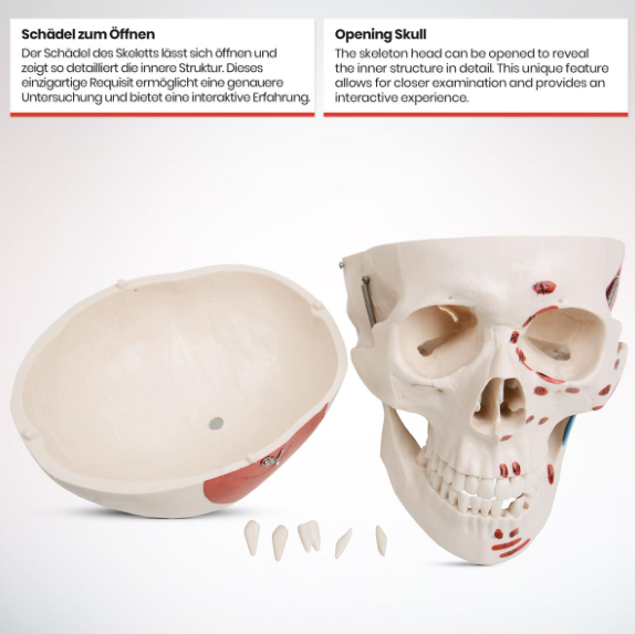 Model je vyrobený z odolného PVC, ľahko sa umýva a je nerozbitný. Pohyblivé končatiny, odnímateľná lebka, čeľusť aj zuby umožňujú praktickú manipuláciu. Stabilný stojan s kolieskami zaisťuje jednoduché premiestňovanie. Montáž je jednoduchá a zvládne ju každý za pár minút.