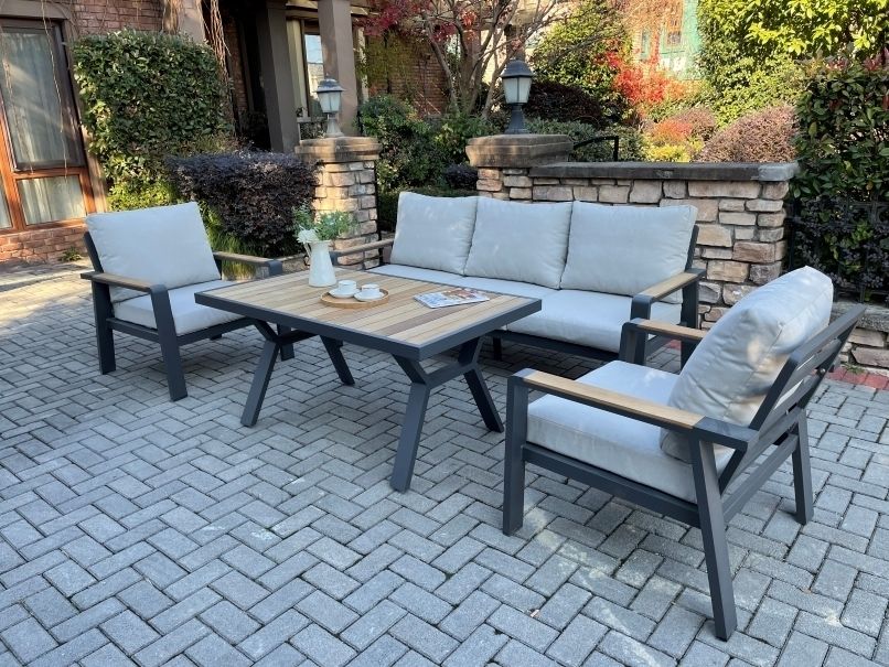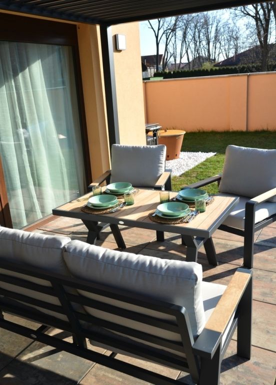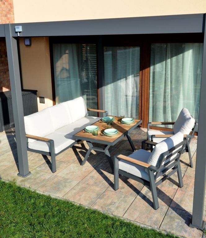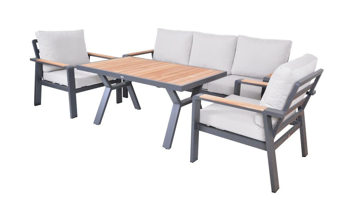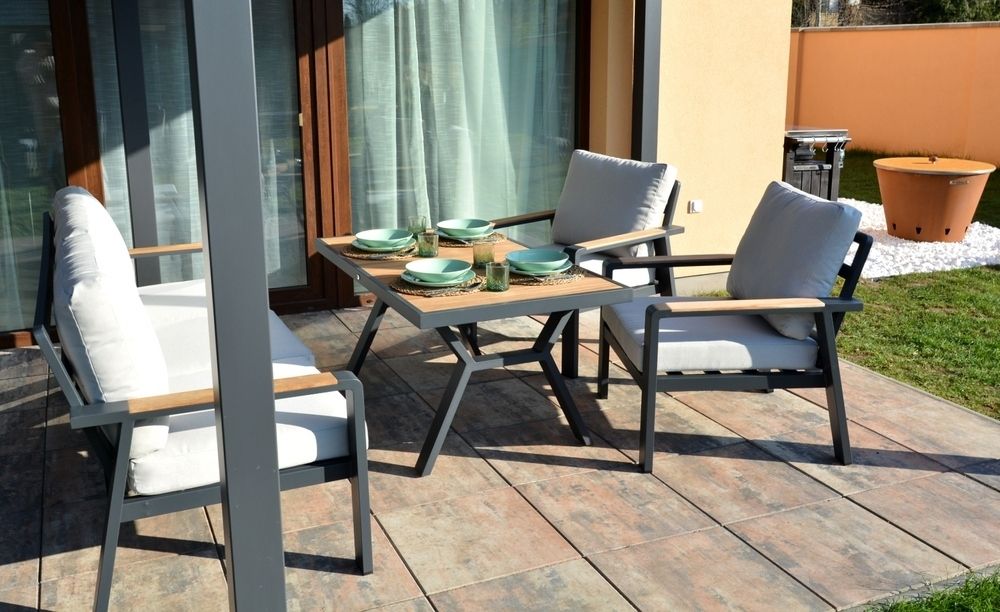 Vytvorte si príjemné miesto na stolovanie s týmto moderným jedálenským stolom z hliníka a teaku. Elegantný grafitový dizajn sa hodí do každého priestoru a vďaka kvalitným materiálom bude stôl slúžiť dlhé roky.