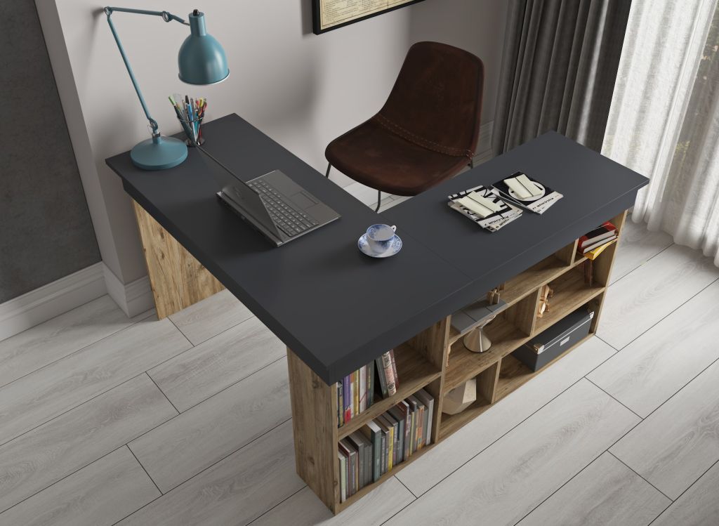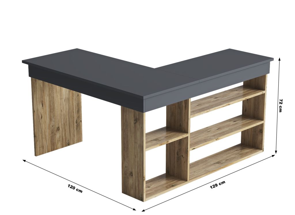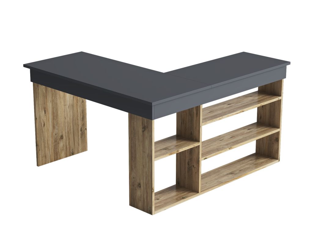Náš pracovný stôl, vyrobený s maximálnou precíznosťou, sa môže pochváliť elegantným a moderným dizajnom, ktorý okamžite pozdvihne estetiku vašej pracovne. Kombinácia farieb antracitovej a atlantickej borovice vytvára vizuálne pôsobivý kontrast, vďaka čomu sa stane skutočným stredobodom každého priestoru.