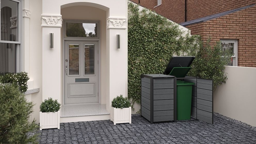 Praktická skriňa na dve 120L nádoby, odolná voči počasiu, moderný vzhľad.