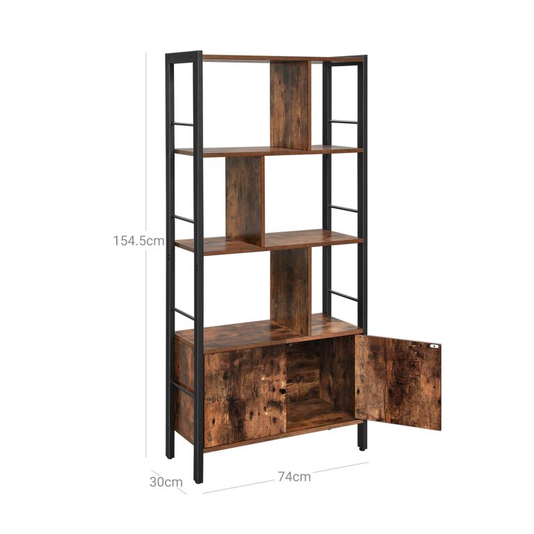 Elegantná kombinácia rustikálnej hnedej a čiernej ocele vdýchne vašej obývačke, pracovni alebo kancelárii jedinečný industriálny nádych. Táto knižnica ponúka štyri otvorené police pre knihy, dekorácie či kvety a uzatvárateľnú skrinku s dvierkami na praktické uloženie vecí, ktoré nechcete mať na očiach. Jej asymetrické členenie pôsobí originálne a dodáva priestoru charakter.