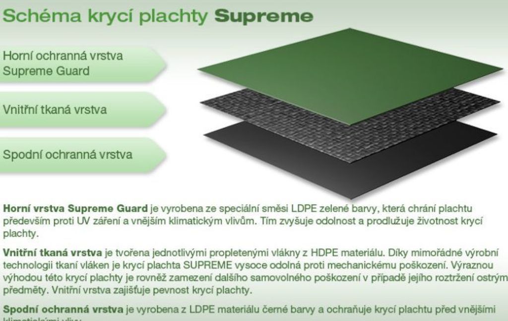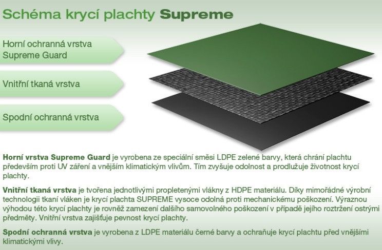 Pre obdobie, kedy nie je bazén používaný, odporúčame jeho zakrytie krycou plachtou. Zamedzíte tým vnikaniu mechanických nečistôt napr. lístia, hmyzu alebo peľu do Vášho bazéna. Vďaka použitiu ochrannej vrstvy Supreme Guard je krycia plachta Supreme pevnejšia a lepšie odoláva poveternostným vplyvom - nejedná sa ale o zimnú plachtu a používanie pri teplotách pod bodom mrazu životnosť krycej plachty znižuje. Farba krycej plachty je zelenočierna alebo modročierna (pri objednávke sa farba nedá zvoliť). K bazénu ju ľahko a rýchlo uchytíte pomocou lanka a napínača s račňou. Oceľové lanko potiahnuté plastovou ochrannou vrstvou aj napínač s račňou sú súčasťou balenia.