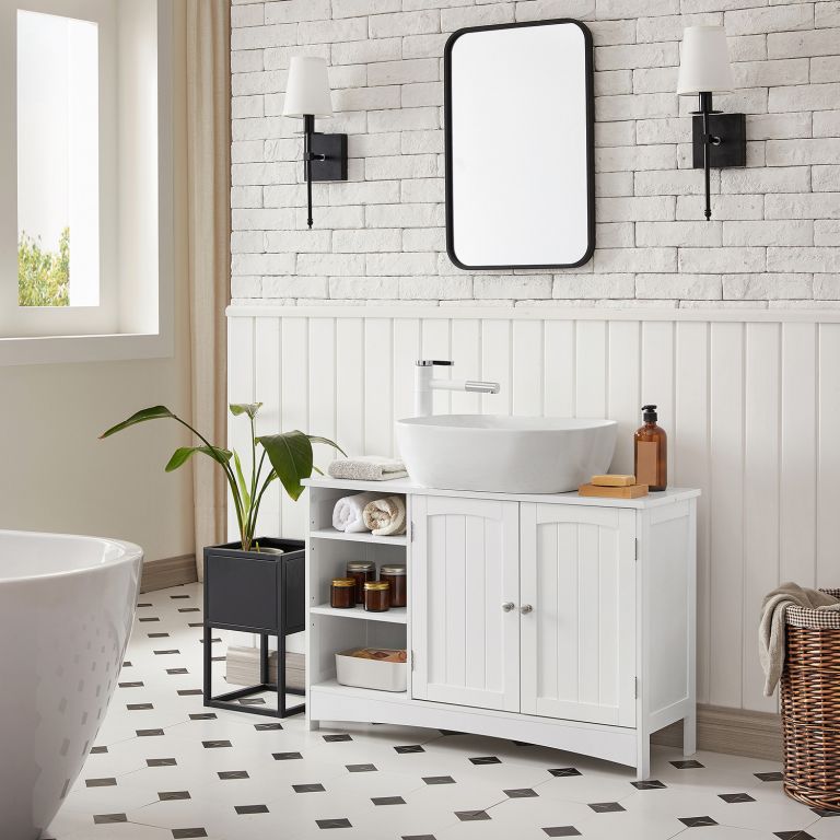 Elegantná biela skrinka pod umývadlom ponúka dostatok úložného priestoru a je ľahko udržiavateľná.