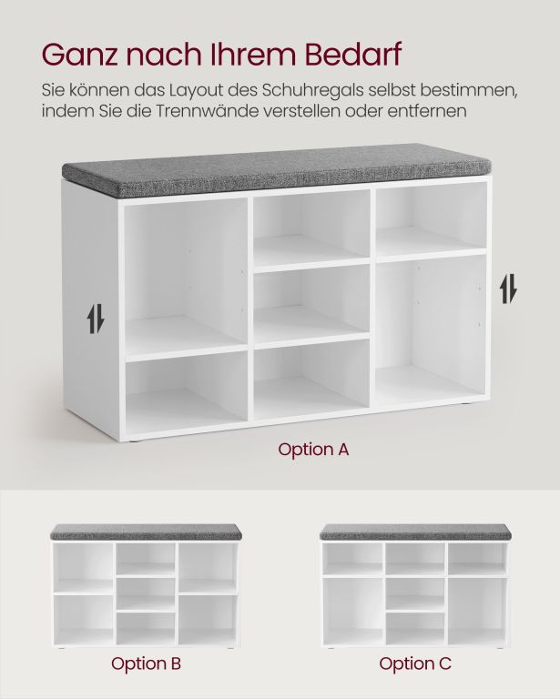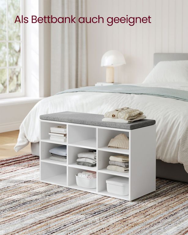 Praktická botník s lavicou a mäkkým vankúšom. Deväť priehradiek na topánky, nastaviteľná veľkosť.