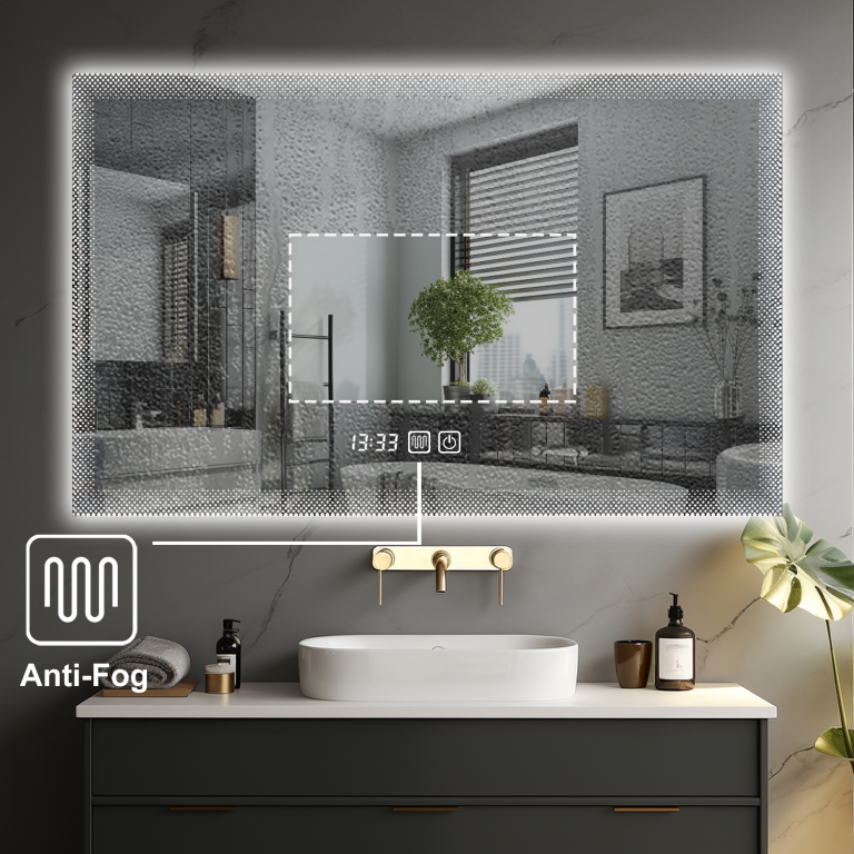 Štýlové LED zrkadlo 90×70 s hodinami a prepínačom izbovej teploty. 3 farby osvetlenia, stmievanie a odmlžovanie.