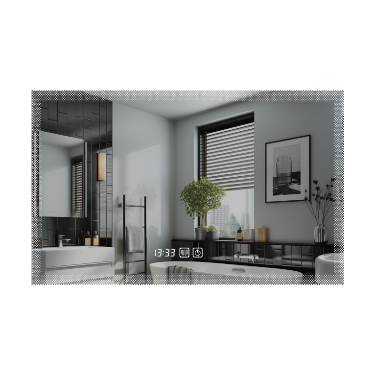 Zobraziť podrobnejší popisŠtýlové LED zrkadlo 90×70 s hodinami a prepínačom izbovej teploty. 3 farby osvetlenia, stmievanie a odmlžovanie.