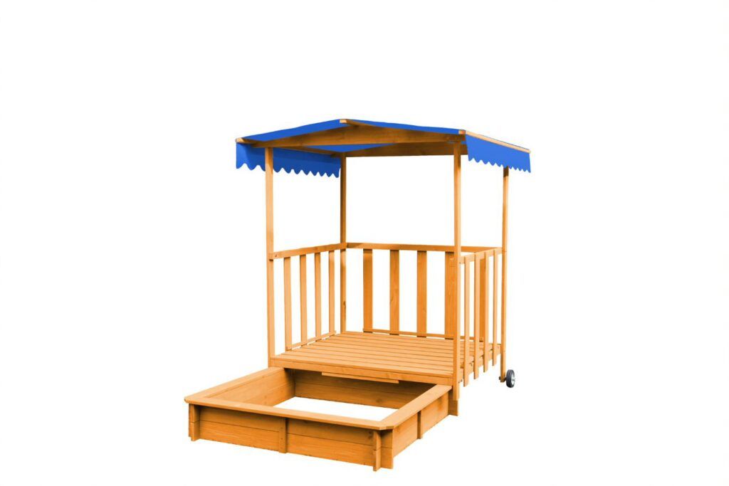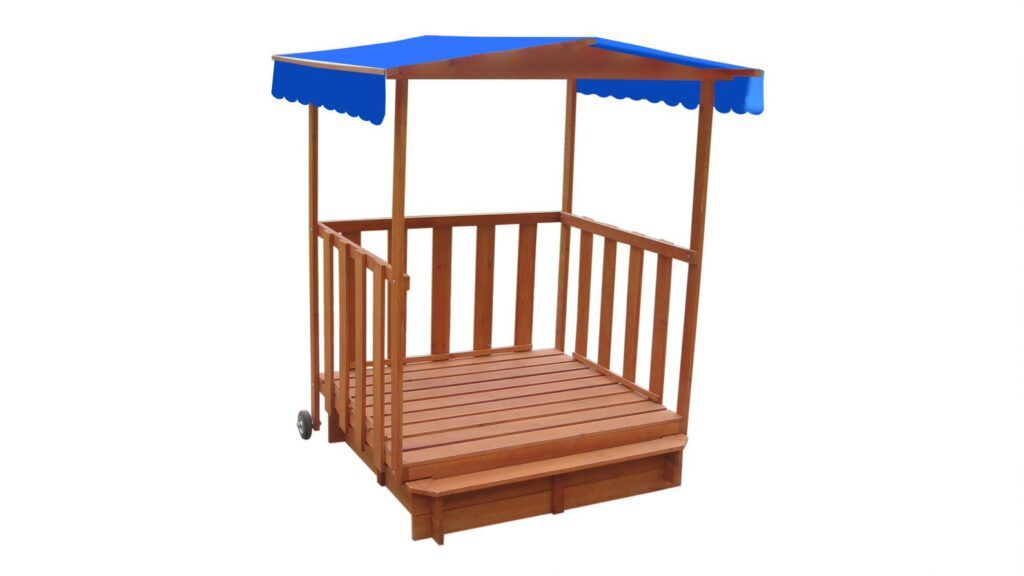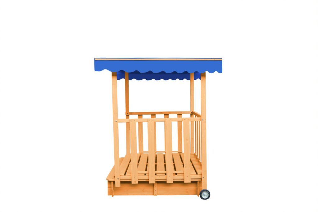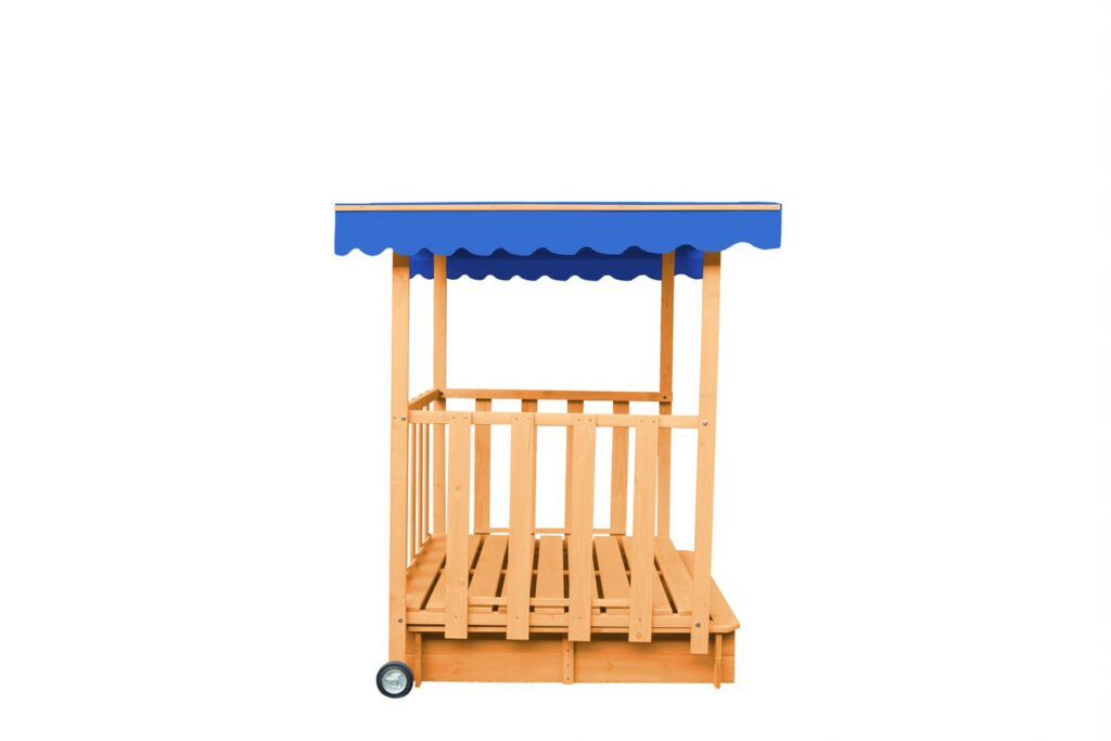 Drevené štvorcové pieskovisko so sedadlami, vrátane altánku so zábradlím a nepremokavou strechou, ktorá chráni pred dažďom aj slnkom. Altánok má kolieska a slúži zároveň ako kryt pieskoviska, keď nie je používané. Altánok je tiež vybavený kolieskami pre ľahšiu manipuláciu. Pieskovisko nemá dno. Všetko drevo je povrchovo upravené pre dlhšiu životnosť.