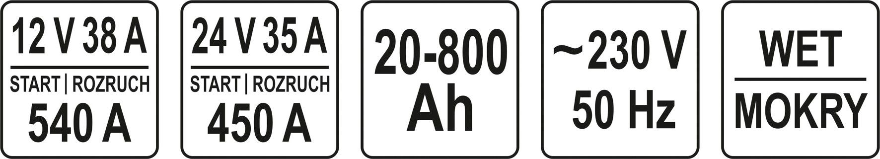 Táto nabíjacia jednotka umožňuje rýchle naštartovanie motora u Vášho vozidla. Batéria disponuje označením: 12 V-540 A / 24 V-450 A.