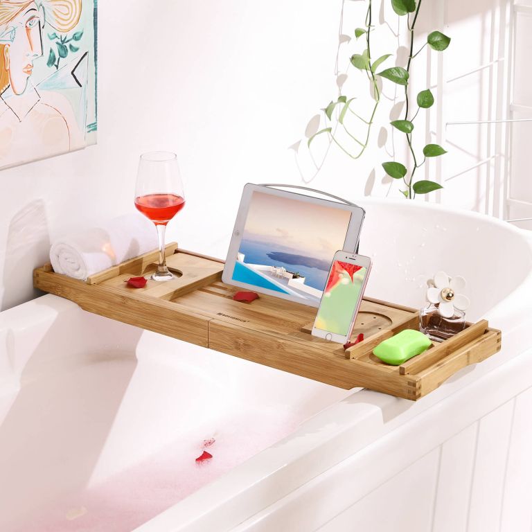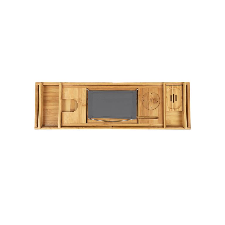 Praktická roztiahnuteľná konštrukcia (75–109 cm) z kvalitného bambusu zaručuje dlhú životnosť a pevnosť. Polica ponúka vyberateľné priehradky, držiak na pohár aj miesto na mydlo či sviečku. Je ideálny pre každého, kto ocenia spojenie funkčnosti a prírodného štýlu – skvelá voľba aj ako darček.