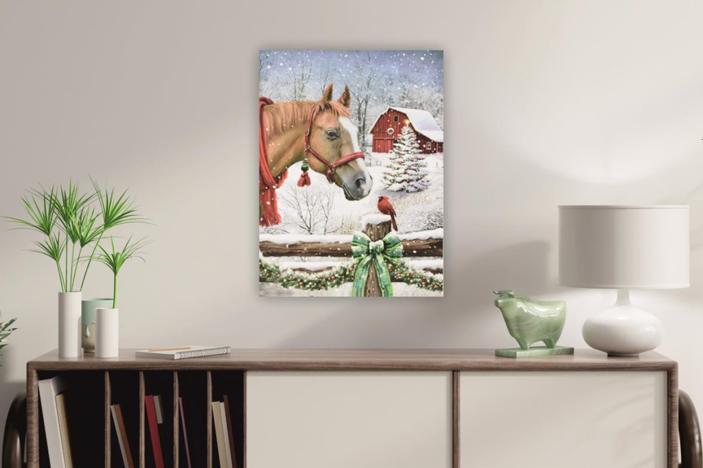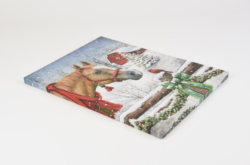 Naše dekoratívne LED obrazy sú k dispozícii v rôznych veľkostiach a designoch. Dodá vášmu schodisku, obývacej izbe, kancelárii alebo spálni farebné akcenty. Tieto dekoratívne obrazy, potlačené modernou, vysoko kvalitnou fotografickou tlačou, sú vždy ozdobou každej miestnosti a rozžiaria vaše okolie. Zimný motív koňa a vrabca na zasneženej farme vytvára príjemnú zimnú náladu a atmosféru. Toto nástenné umenie žiari očarujúcim svetlom vďaka jednej LED dióde a 40 optickým vláknam. Vysoko kvalitná fotografická tlač na plátne je nielen ideálna na Vianoce, ale aj krásnou dekoráciou alebo skvelým darčekom. Osvetlenie zaisťujú energeticky úsporné LED diódy.