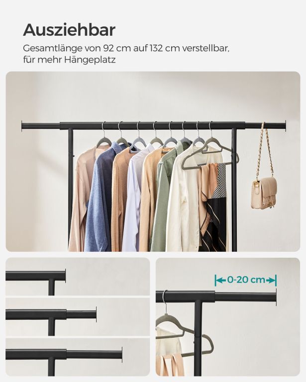 Vytvorte si dokonalý prehľad vo svojej šatníku s týmto priestranným vešiakom na oblečenie. Rozťahovateľná horná tyč ponúka priestor na kabelky a šály, zatiaľ čo elegantný čierny dizajn sa perfektne hodí do každého interiéru.