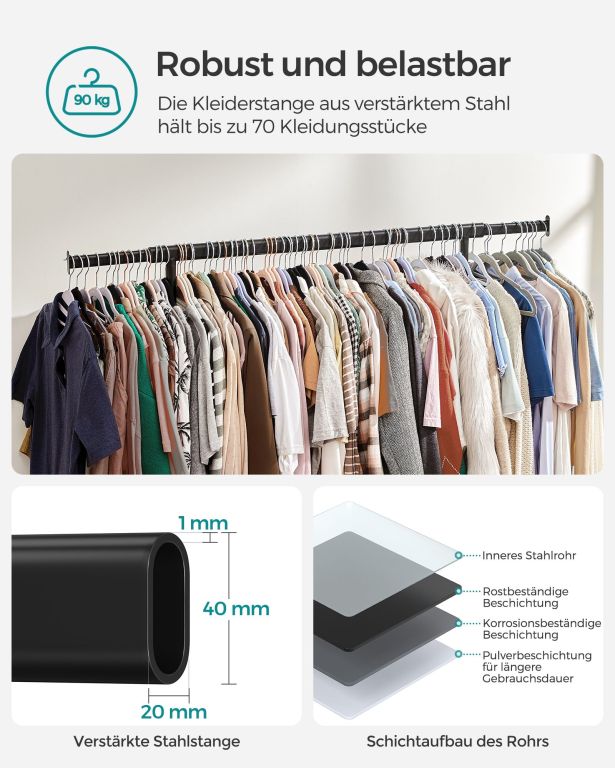 Stabilný vešiak na oblečenie s výsuvnou tyčou a nosnosťou 90 kg. Jednoduchá montáž a presun.