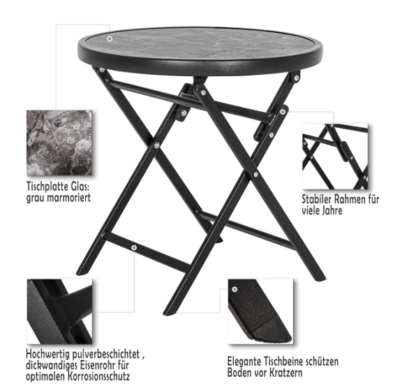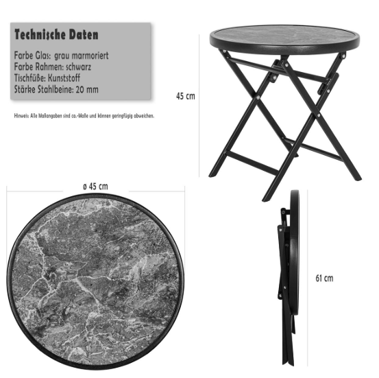 Tento praktický okrúhly stolík so sklenenou doskou a skladacou oceľovou konštrukciou je ideálny na podávanie nápojov a jedál v záhrade alebo zimnej záhrade, na balkóne alebo terase. Sklenený stolík je mimoriadne stabilný a ponúka priestrannú plochu. Sklopný rám poskytuje dodatočnú stabilitu a pevnosť. Tento stolík je odolný voči poveternostným vplyvom a ľahko sa čistí. Plocha stolíka s priemerom 45 cm ponúka priestor pre poháre, fľaše, taniere alebo časopisy. Výška stolíka je približne 45 cm. Tento vizuálne pôsobivý kovový stolík je ideálnym doplnkom vášho záhradného nábytku. Pozrite si aj naše ďalšie zaujímavé záhradné doplnky, ako sú skladacie stoličky, stohovateľné stoličky, záhradné stoly, slnečníky, súpravy a záhradné stoly.