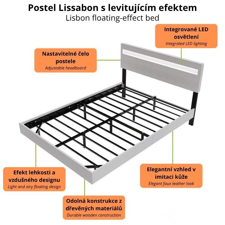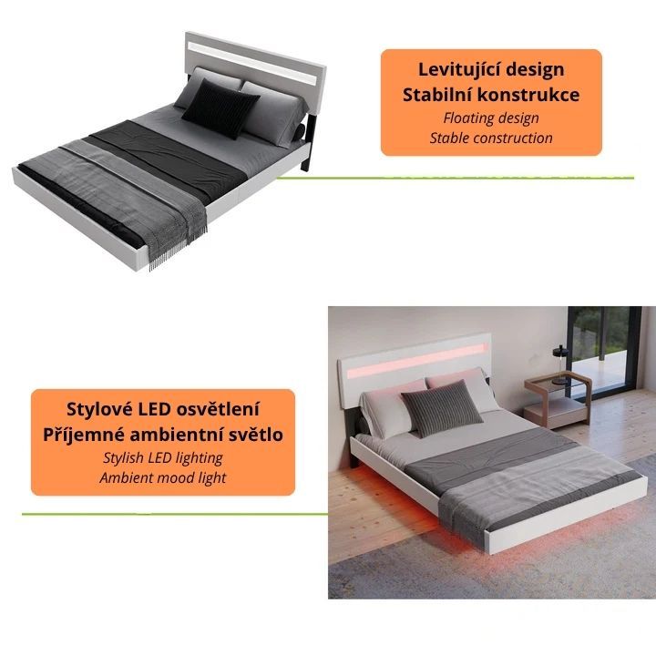 Plávajúca posteľ 140x200 cm, biela s LED čelom