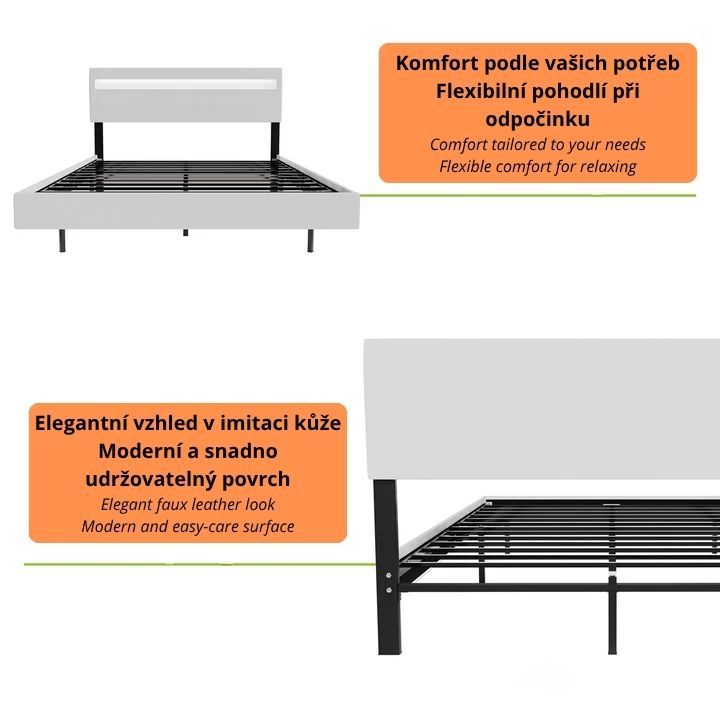 Robustná konštrukcia z MDF, kovu a peny zaručuje dlhú životnosť a stabilitu. Ľahká údržba vďaka povrchu v imitácii kože, nastaviteľné čelo pre individuálne prispôsobenie a LED pásik s diaľkovým ovládaním s 16 farbami. Ideálna voľba pre moderné interiéry a náročných používateľov.