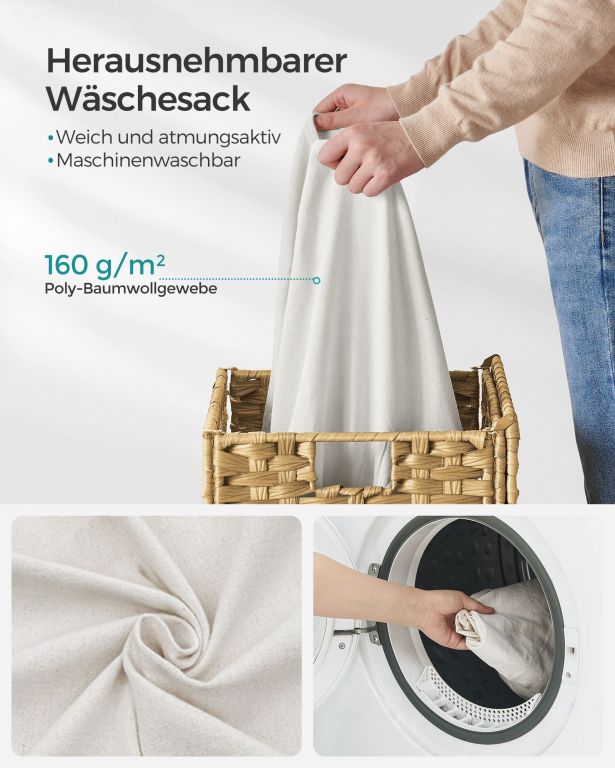 Odolná konštrukcia z umelého ratanu a kovového rámu zaručuje dlhú životnosť aj vo vlhkom prostredí. Vyberateľná bavlnená vložka umožňuje ľahkú prepravu bielizne, zatiaľ čo silikónové nožičky chránia podlahu. Montáž je rýchla a kôš je možné zložiť, aby šetril miesto.