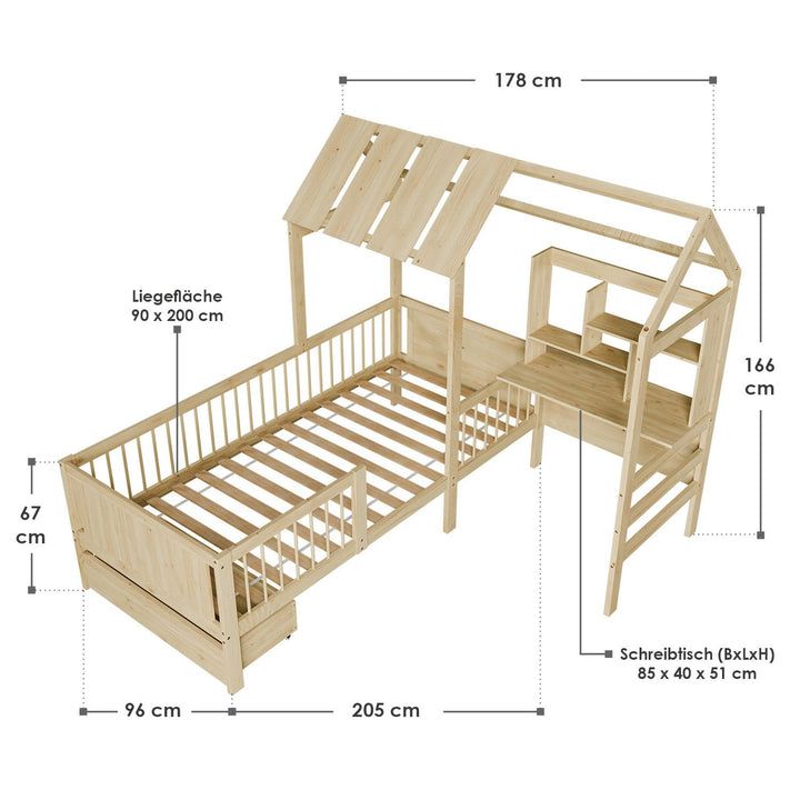 Detská posteľ Natural očarí každé dieťa i rodičov svojím originálnym vzhľadom pripomínajúcim domček. Vytvára bezpečné a inšpirujúce miesto na hranie, oddych a učenie. Praktické zásuvky a písací stôl umožňujú deťom mať všetko potrebné po ruke a zároveň udržiavať izbu upratanú.
