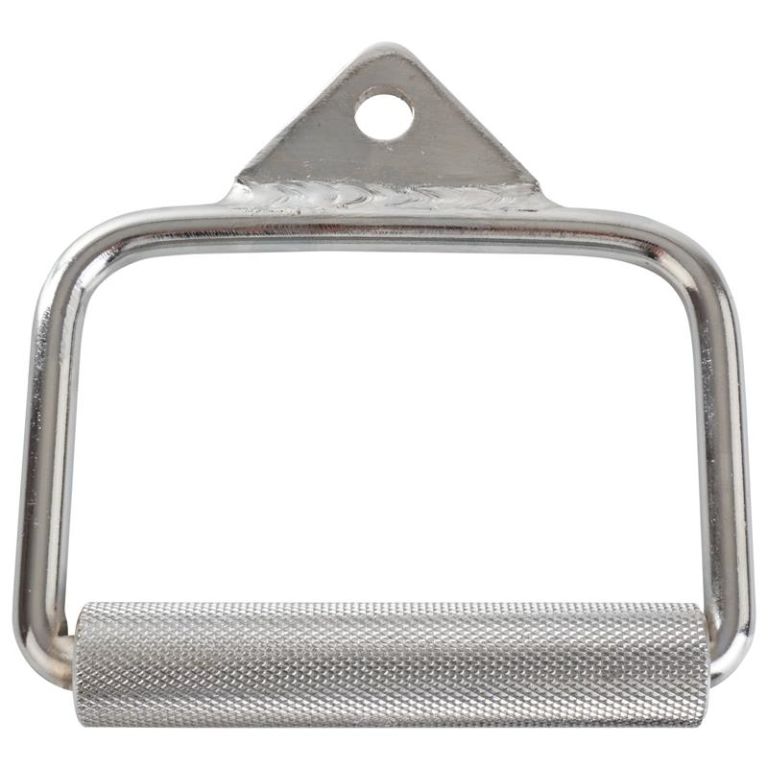 Vyrobená z masívnej ocele s chrómovou povrchovou úpravou, rukoväť je odolná proti opotrebeniu a ľahko sa pripája pomocou karabíny. Otočná rukoväť zaisťuje voľnosť pohybu pri rôznych cvičeniach, zatiaľ čo vroubkovaný povrch zlepšuje priľnavosť aj pri intenzívnom tréningu. Údržba je jednoduchá, stačí utrieť vlhkou handričkou.